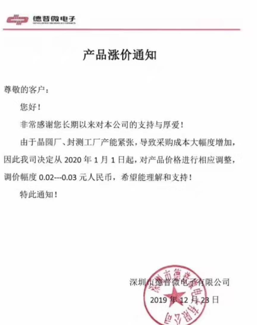 从12月23号德普微发布涨价通知后,富满在12月24发布通知,FS8205S(SOT23-6)涨价0.01,FS8205A(TSSOP8的涨价0.01,接着就收到广东科通发布的DW01和8205S分别涨0.01,广州迪浦的PT8205和PT8202分别涨0.01和0.02,深圳卓朗微的ZL8205也接着涨价了。